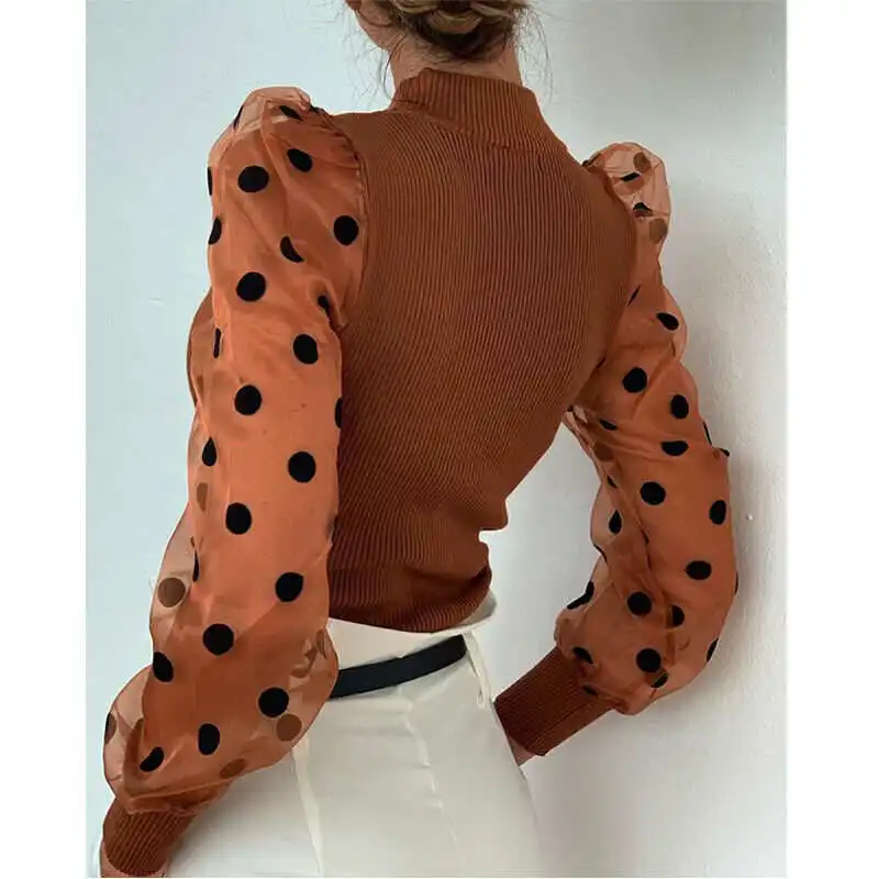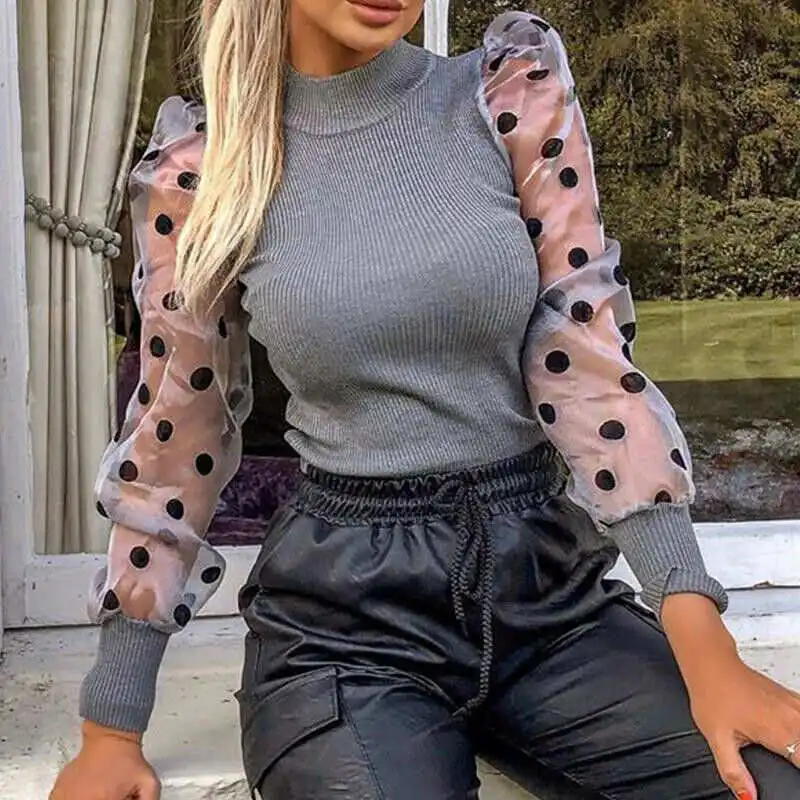 Женский вязаный тонкий Топ с длинным рукавом и стоячим воротником