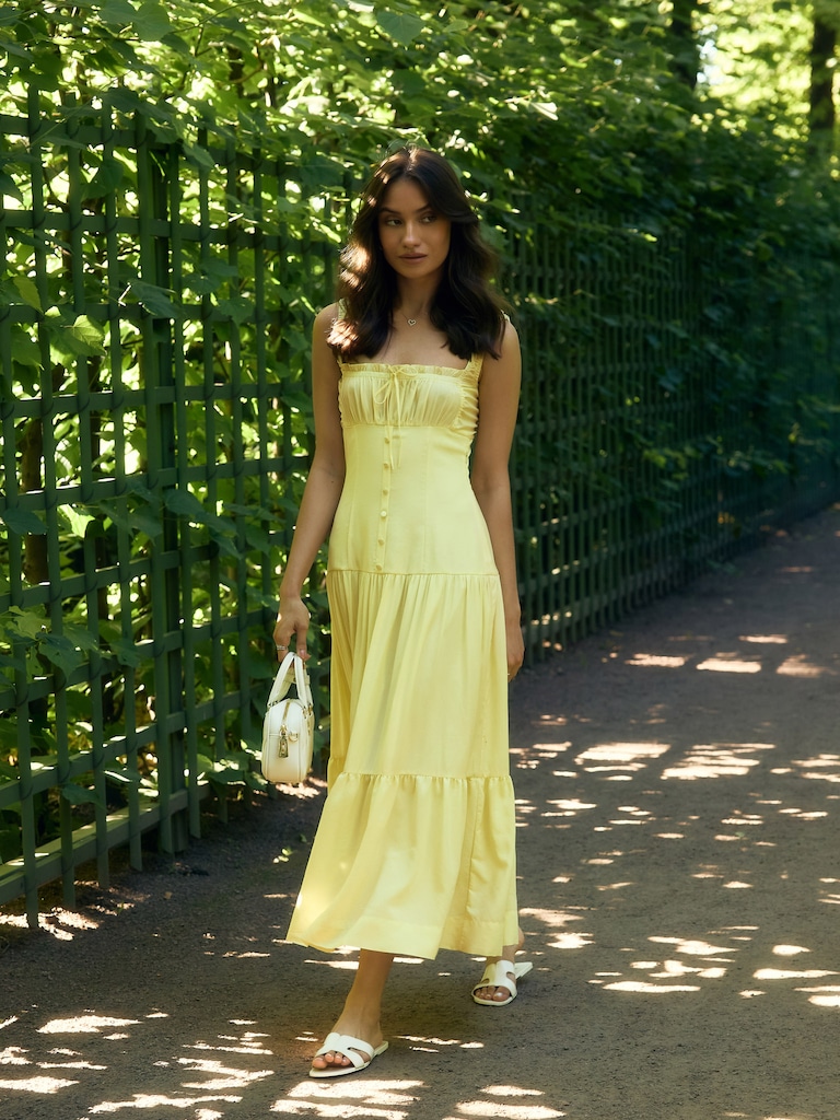Платье миди на бретелях со сборками и бантом на лифе :: LICHI